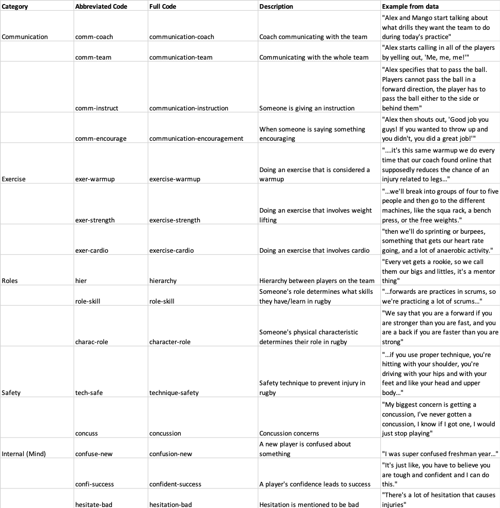 One of the more difficult problems that I encountered doing this part of the process was figuring out which codes I wanted to write about in my memos. I felt that all of my codes helped me answer the question, “How do rugby players participate in rugby?”.