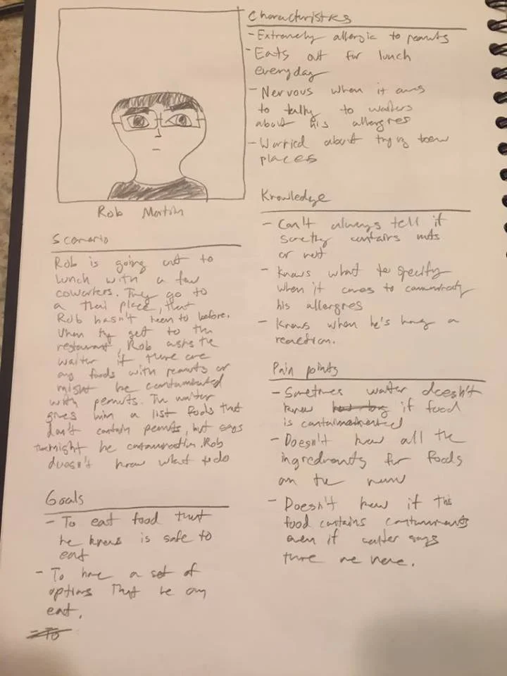 The next step was to create a user journey for one of my personas. I chose to focus on Rob for my user journey instead of Jodie, because of his characteristics of having more severe allergies and having problems such as worrying about contamination, while Jodie only focused on finding dishes that didn't have the allergens. By creating a user journey for the persona, I was able to capture his daily life and all of his emotions that he felt throughout the day.