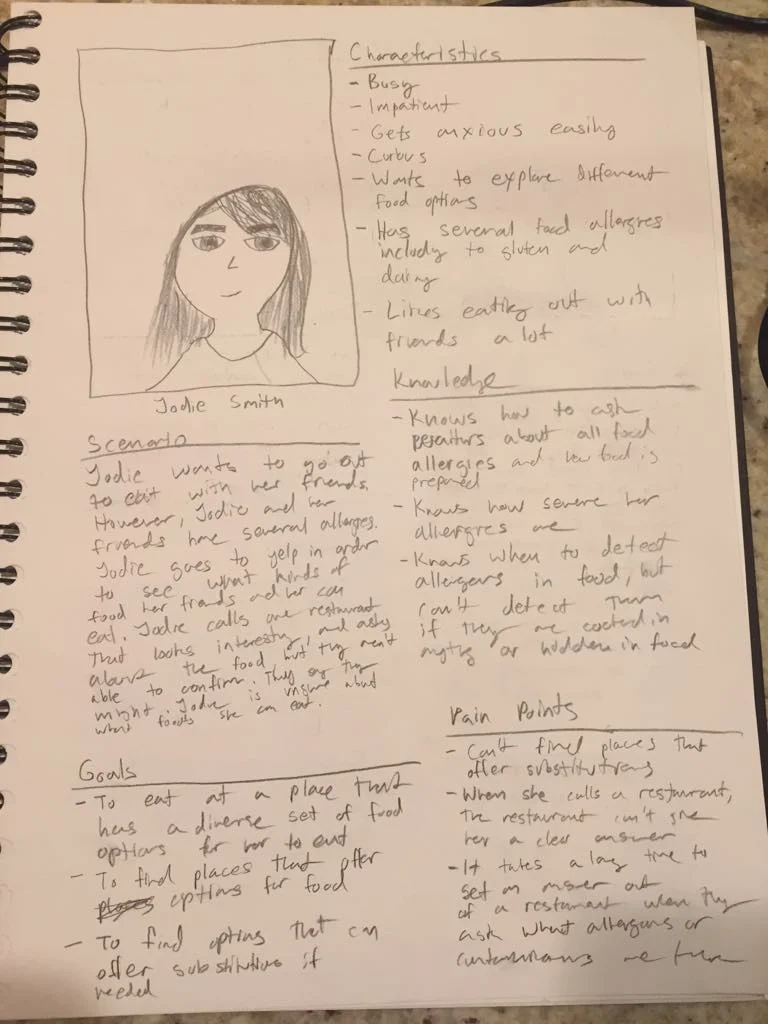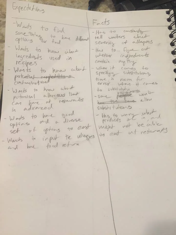 The interviews we conducted confirmed our belief that eating out at restaurants is difficult and nerve-racking for people with food allergies. We learned in depth what a typical experience at a restaurant for someone with food allergies is like. A typical individual with food allergies faces many challenges before even sitting down with family or friends to eat. Potential users said that finding restaurants that accommodate their allergies was time consuming. Users have to research the facility in which the ingredients were manufactured in, if the restaurant itself is aware of precautions that need to be taken for individuals with food allergies, and what ingredients are in the dishes. Other issues arise when it comes time for individuals with food allergies to actually eat. Some of them include, a possible contamination of food, misinformation from waiters or chefs, and even mislabeled ingredients. People with food allergies appear, in large part, to be a misunderstood and underrepresented group. The average person is unaware of the potentially fatal consequences of unintentionally contaminating food. An application to aid individuals with food allergies is not only necessary for matters of efficiency but for matters of the health and safety.
